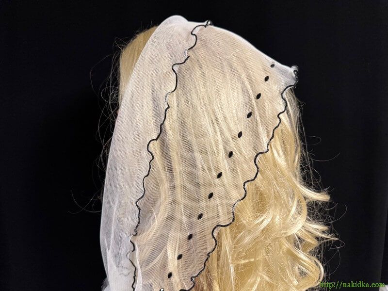 | Белый фатиновый шарф с волнистым черным ободком и с наклеенными черными овальными камушками с одной стороны |