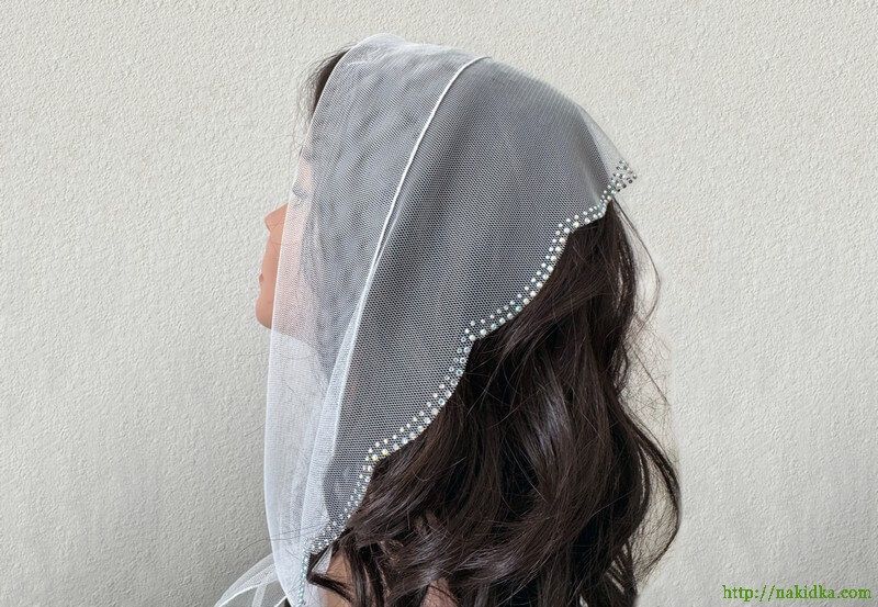 | Белый фатиновый треугольный шарф с наклеенным блестящим узором на вырезанной задней кромке |