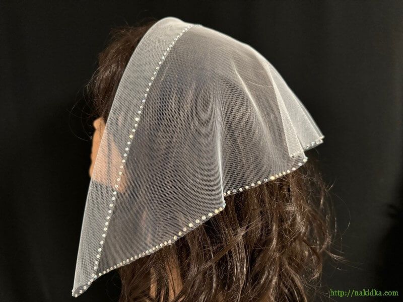 | Белая фатиновая накидка с наклееными блестящими камушками на ободке |