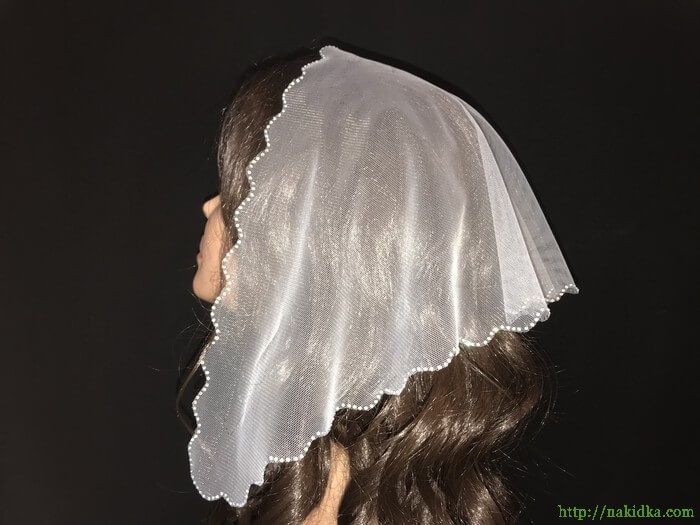 | Белая легкая фатиновая накидка с волнистой кромкой с наклееными по ее контуру блестящими камушками |