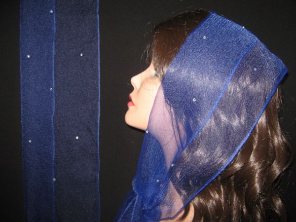 | Синий однотонный нейлоновый шарф с наклеенными блестящими камешками |