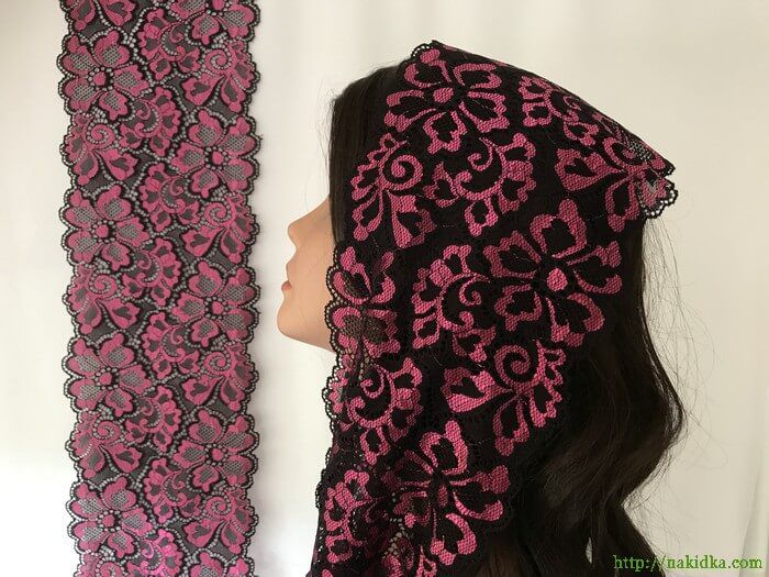 : Темно-розовый с черным стрейчевый гипюровый шарф с узором