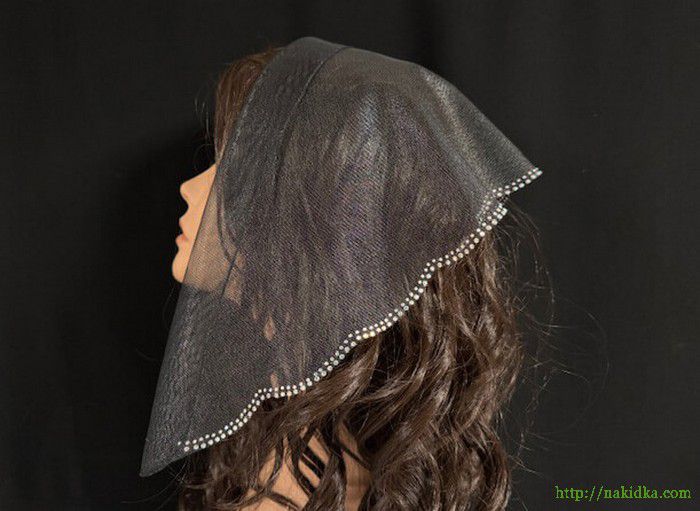 | Черная с отливом фатиновая накидка с наклееными сзади по контуру блестящими камушки |