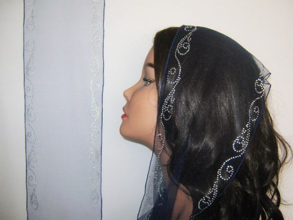 | Темно-синий шарф из легкого тонкого фатина с наклееным блестящим узором и синим ободком |