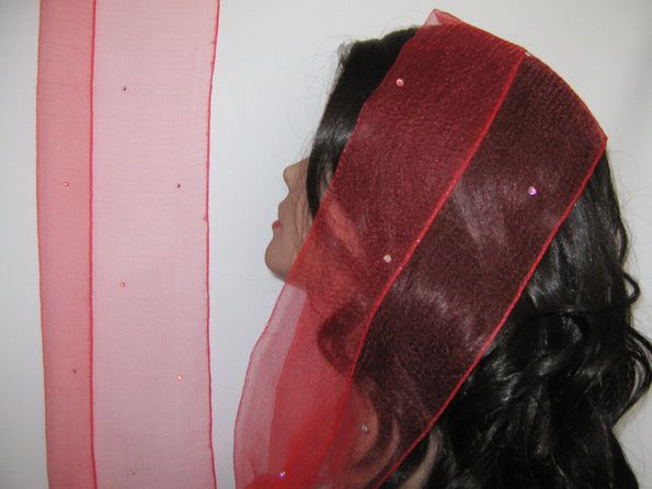 | Красный однотонный нейлоновый шарф с наклеенными блестящими камешками |