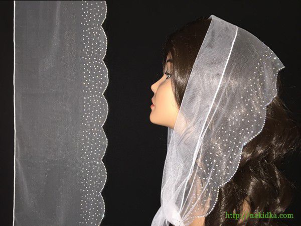 | Белый легкий фатиновый шарф с наклееным блестящим узором по одному ободку |