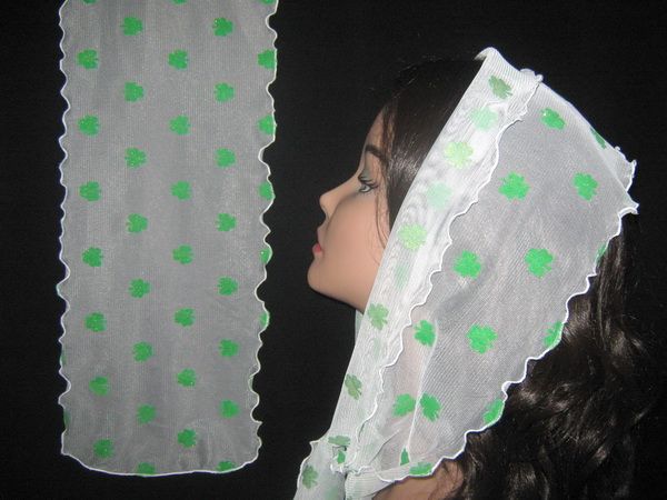 | Белый фатиновый шарф с зелеными листиками и белым волнистым ободком |
