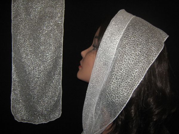 | Белый фатиновый шарф с вышитым серебристым узором и белым ровным ободком |