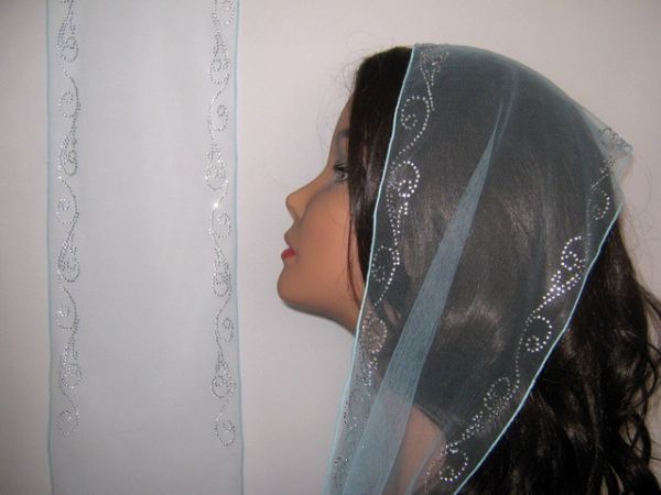 | Голубой шарф из легкого тонкого фатина с наклееным блестящим узором и голубым ободком |