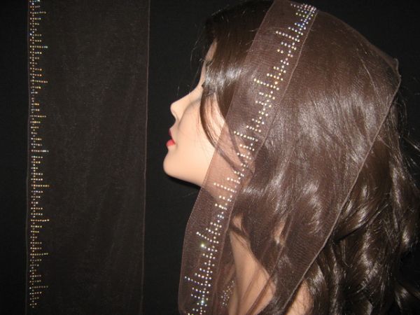 | Темно-коричневый шарф из легкого тонкого фатина с наклееным перламутровым узором и коричневым ободком |