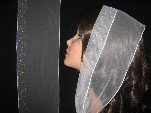 | Белый шарф из легкого тонкого фатина с наклееным перламутровым узором и белым ободком |