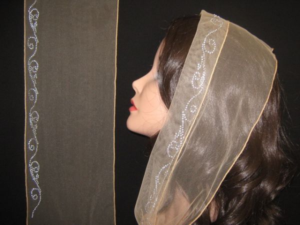 | Бежево-кофейный легкий фатиновый шарф с наклееным блестящим узором |