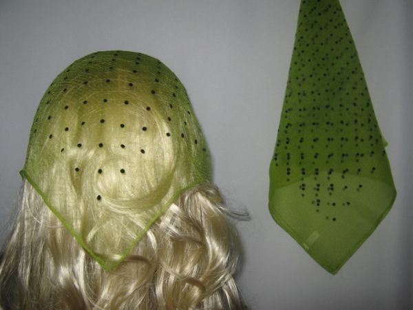 | Зелено-оливковая нейлоновая косынка в мелкий черный горошек |