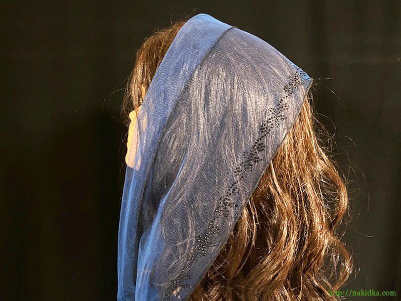 | Темно-синий шарф из легкого тонкого фатина с наклееным черным узором и синим ободком |