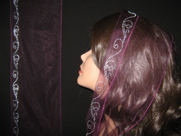 | Фиолетово-баклажановый легкий фатиновый шарф с наклееным блестящим узором |