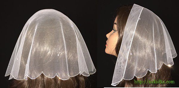 | Белая легкая фатиновая накидка с наклееными блестящими камушками и перламутровым узором по задней кромке |