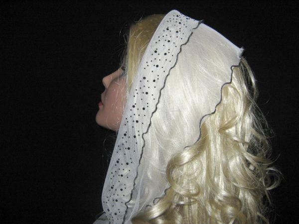 | Белый фатиновый шарф с наклееным черным узором (для подворачивания края шарфа на голове) и черным волнистым ободком |