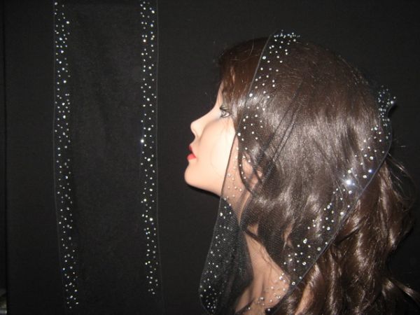 | Черный шарф из легкого тонкого фатина с наклееным блестящим узором и черным прямым ободком |
