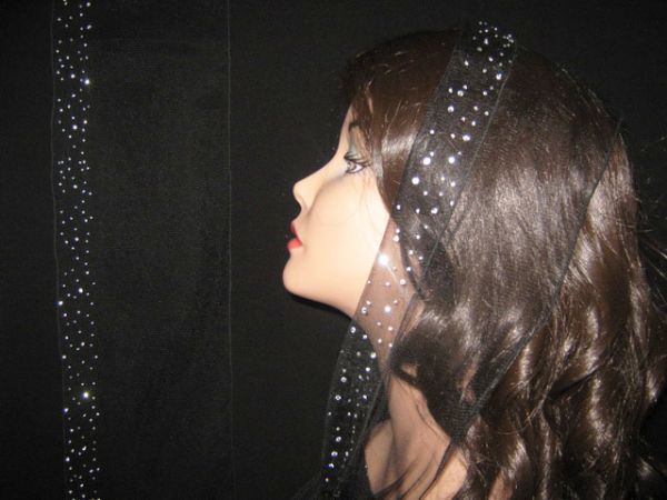 | Черный шарф из легкого тонкого фатина с наклееным блестящим узором и черным прямым ободком |