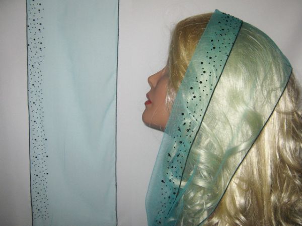 | Бирюзово-зеленый фатиновый шарф с наклееным черным узором и черным ободком |