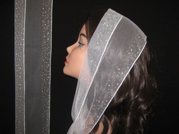 | Белый фатиновый шарф с наклееным блестящим узором с лицевой и обратной стороны (для подворачивания края шарфа на голове) и белым ободком |