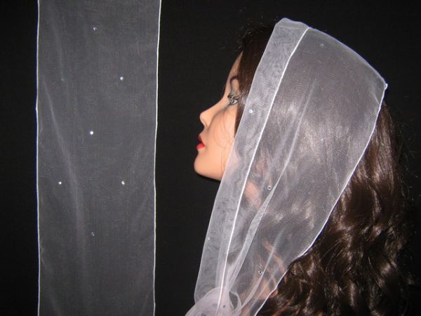 | Светло-светло-розовый фатиновый шарф с наклееными блестящими камешками и прямым ободком |