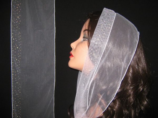 | Светло-светло-розовый фатиновый шарф с наклееным перламутровым узором |
