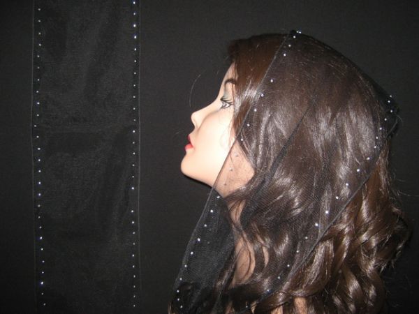 | Черный шарф из легкого тонкого фатина с наклееным блестящим узором и черным прямым ободком |
