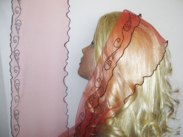 | Kрасный шарф из легкого тонкого фатина с наклееным черным узором и черным волнистым ободком |