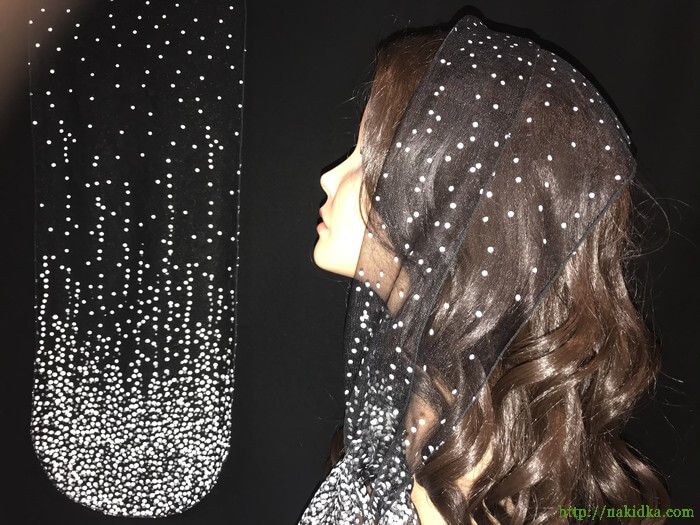| Черный легкий фатиновый шарф с белым и серебристым горошком |