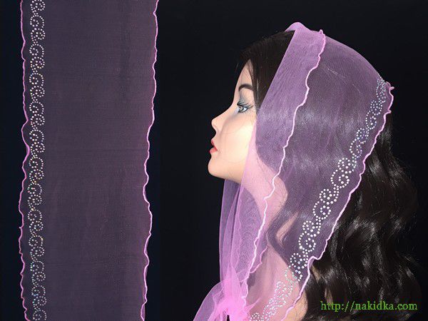 | Розовый легкий фатиновый шарф с наклееными блестящими камушками по всей поверхности шарфа |