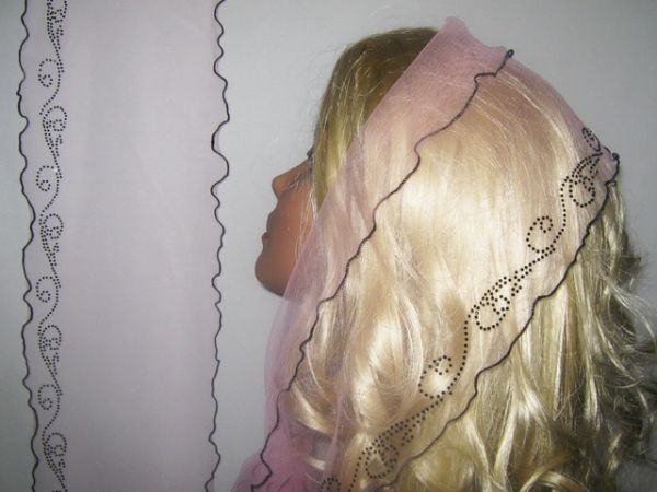 | Розовый шарф из легкого тонкого фатина с наклееным черным узором и черным волнистым ободком |