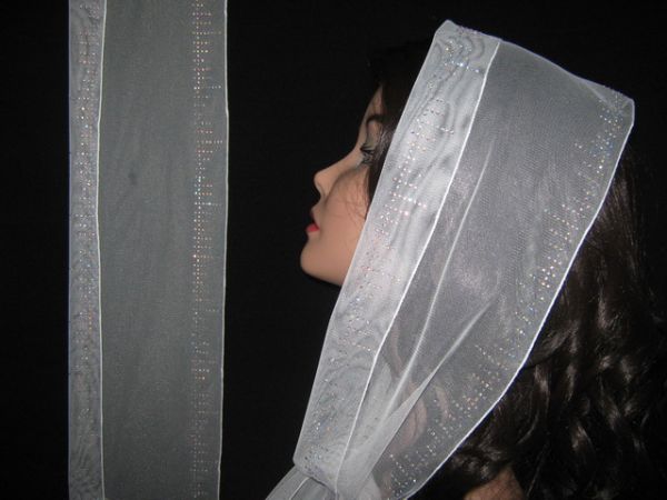 | Белый с отливом фатиновый шарф с наклееным перламутровым узором (для подворачивания края шарфа на голове) и белым прямым ободком |