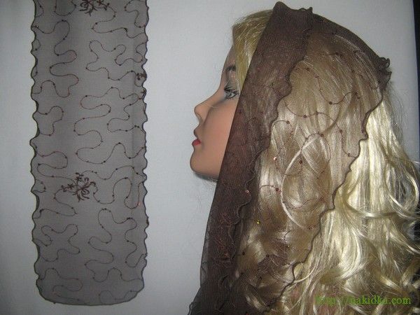 | Коричневый фатиновый шарф с аппликацией и вышитым узором и волнистым ободком |