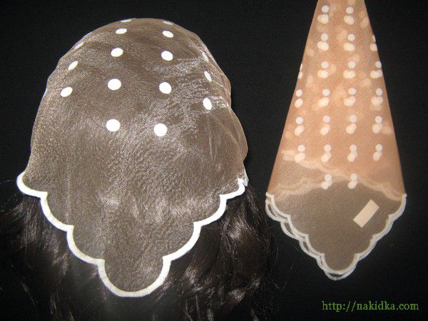 | Персиково-оранжевая нейлоновая косынка в крупный белый горошек с белым ободком |