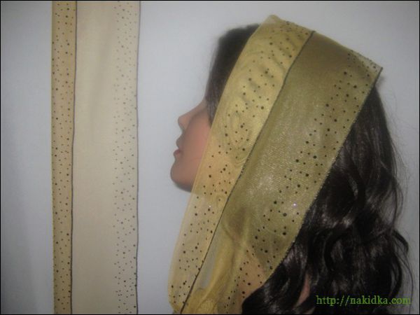 | Темно-желтый фатиновый шарф с наклееным черным узором и черным ободком |
