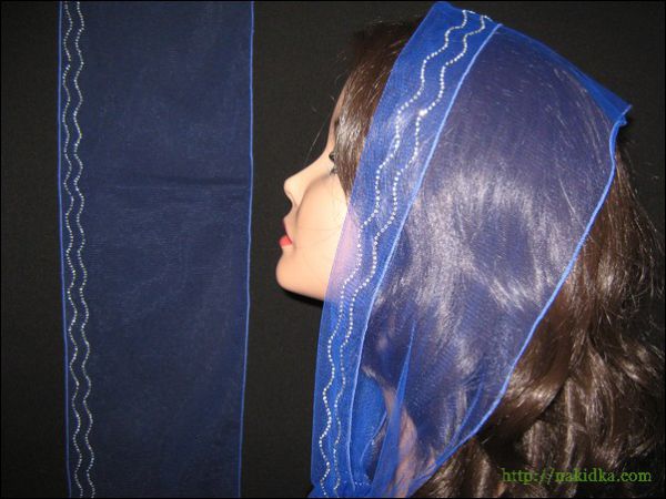 | Синий шарф из легкого тонкого фатина с наклееным блестящим узором и синим ободком |