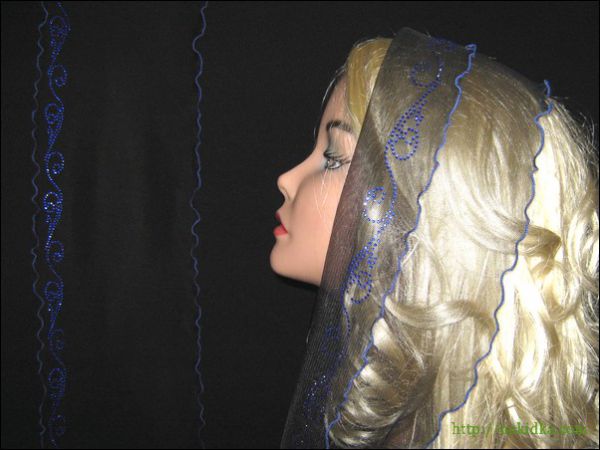 | Черный фатиновый шарф с наклееным синим узором и синим волнистым ободком |
