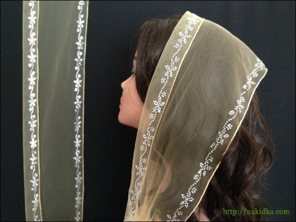 | Бежевый легкий фатиновый шарф с наклееным блестящим узором по краям (для подворачивания края шарфа на голове) |