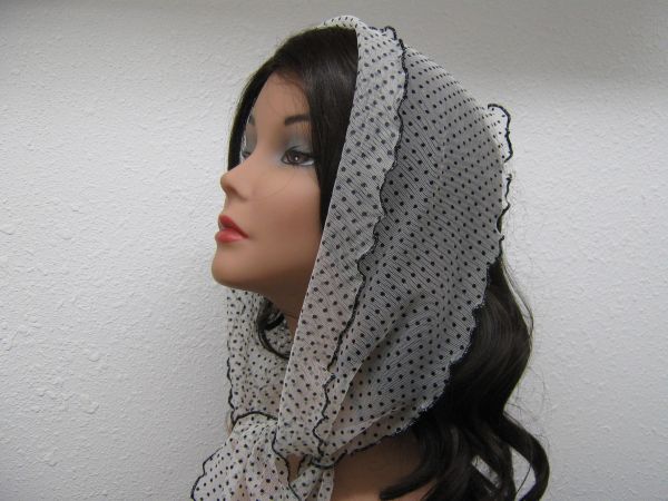 | Бело-желтый фатиновый шарф с мелким черным горошком и черным волнистым ободком |