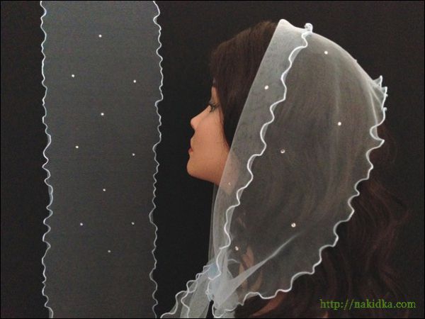 | Светло-голубой шарф из легкого фатина с наклееными блестящими камушками и волнистым ободком |
