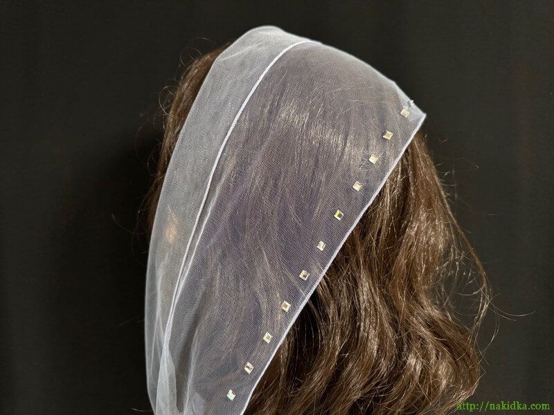 | Светло серый с сиреневым оттенком фатиновый шарф с наклеенными квадратными камушками |