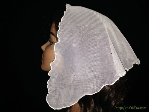 | Белая стрейчевая фатиновая накидка с наклееными перламутровыми камушками и волнистым ободком |