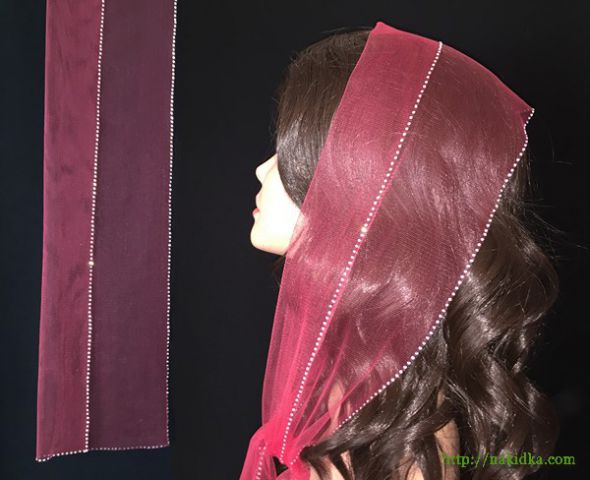 | Темно-красный легкий фатиновый шарф с наклееным блестящим узором по контуру |