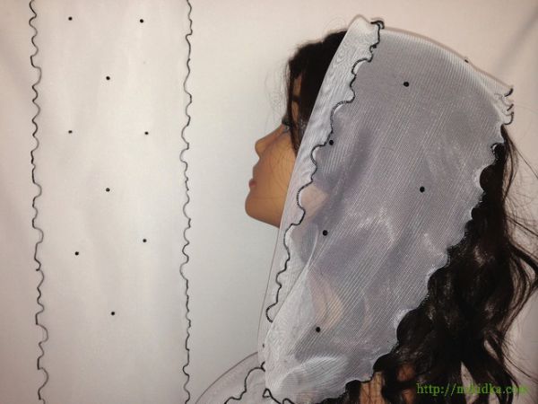 | Белый фатиновый шарф с наклееными черными камушками и черным ободком |