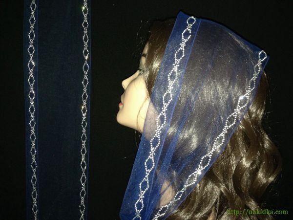 | Темно-синий шарф из легкого тонкого фатина с наклееным блестящим узором с лицевой и обратной стороны (для подворачивания края шарфа на голове) и синим ободком |