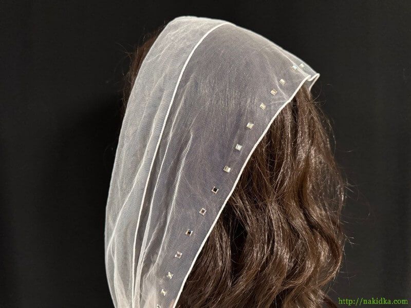 | Белый фатиновый шарф с квадратными блестящими наклеенными камушками с одной стороны |