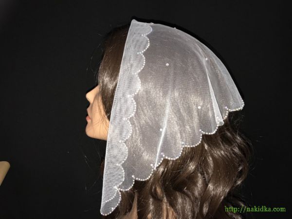 | Белая легкая фатиновая накидка с наклеенными блестящими камушками и перламутровым узором на волнистом ободке |