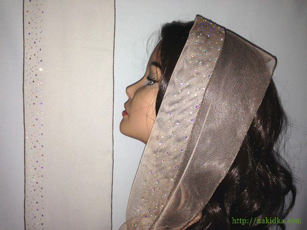 | Кофейный фатиновый шарф с наклееным перламутровым узором и прямым ободком |