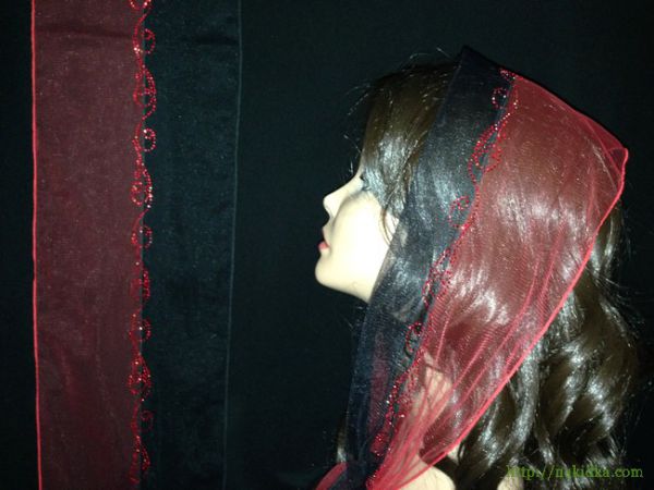 | Черный с красным двутонный легкий фатиновый шарф с наклееным красным узором и прямым ободком |